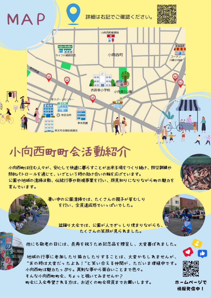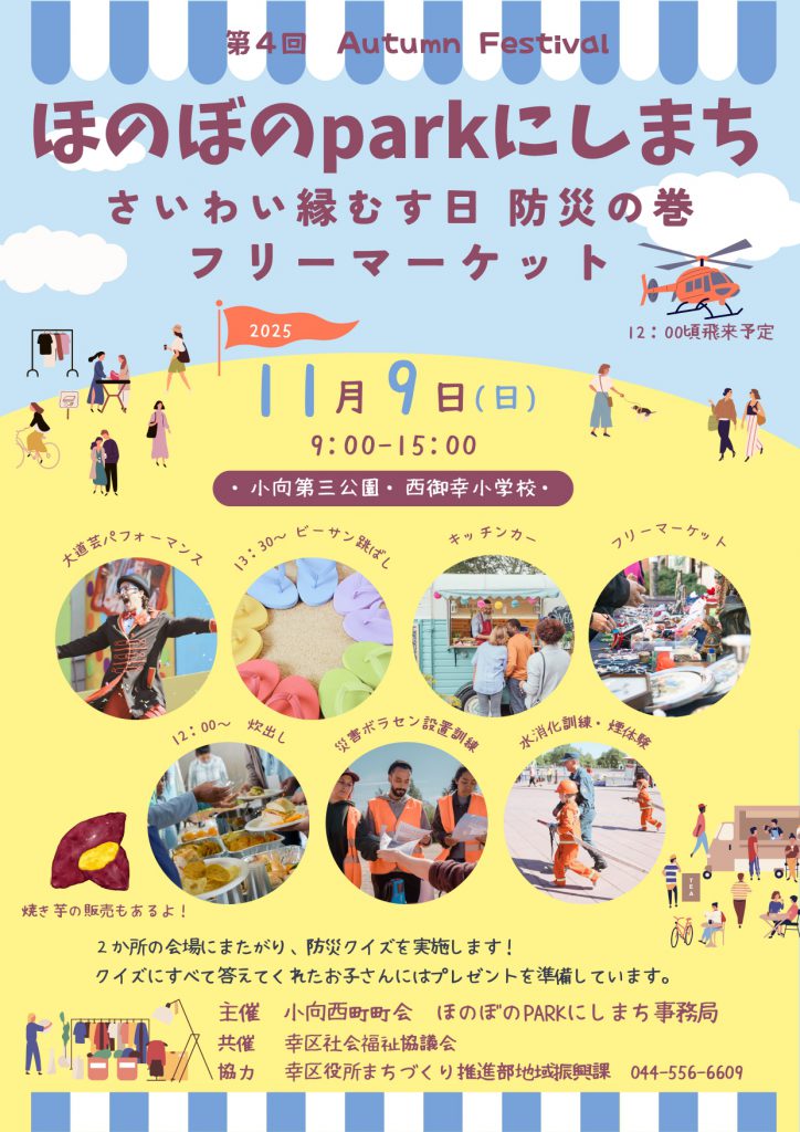 今年のさいわい縁むす日事業では、これまで小向西町町会で行われていた「ほのぼのparkにしまち」とコラボし、防災に関する取り組みを加え、『ほのぼのparkにしまち さいわい縁むす日防災の巻』として開催いたします!