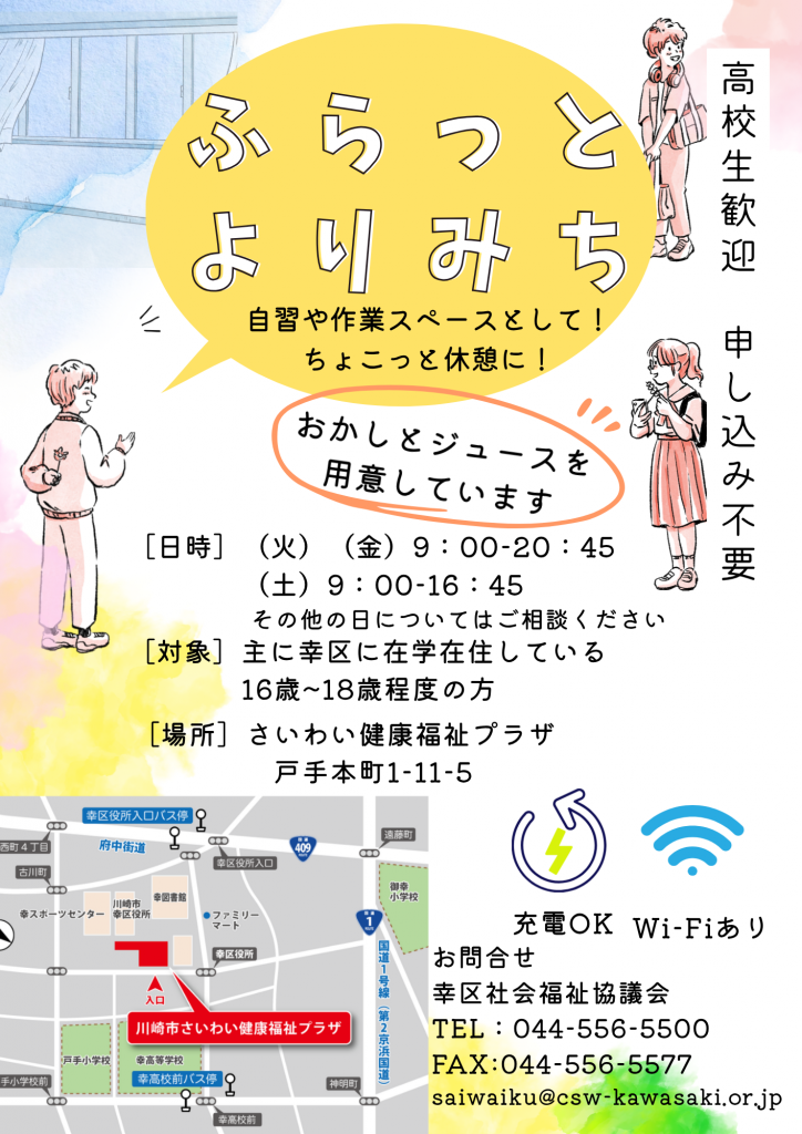 | ●対 象 :幸区に住んでいる もしくは 通学している16~18歳くらいの 高校生世代の方 ●場 所 :さいわい健康福祉プラザ(戸手本町1-11-5) ●時 間 :火・金曜 ▶9:00~20:45 土曜 ▶9:00~16:45 ※そのほかの曜日のご利用はご相談ください。 ●問合わせ:幸区社会福祉協議会 TEL:044-556-5500 ✉ :saiwaiku@csw-kawasaki.or.jp |