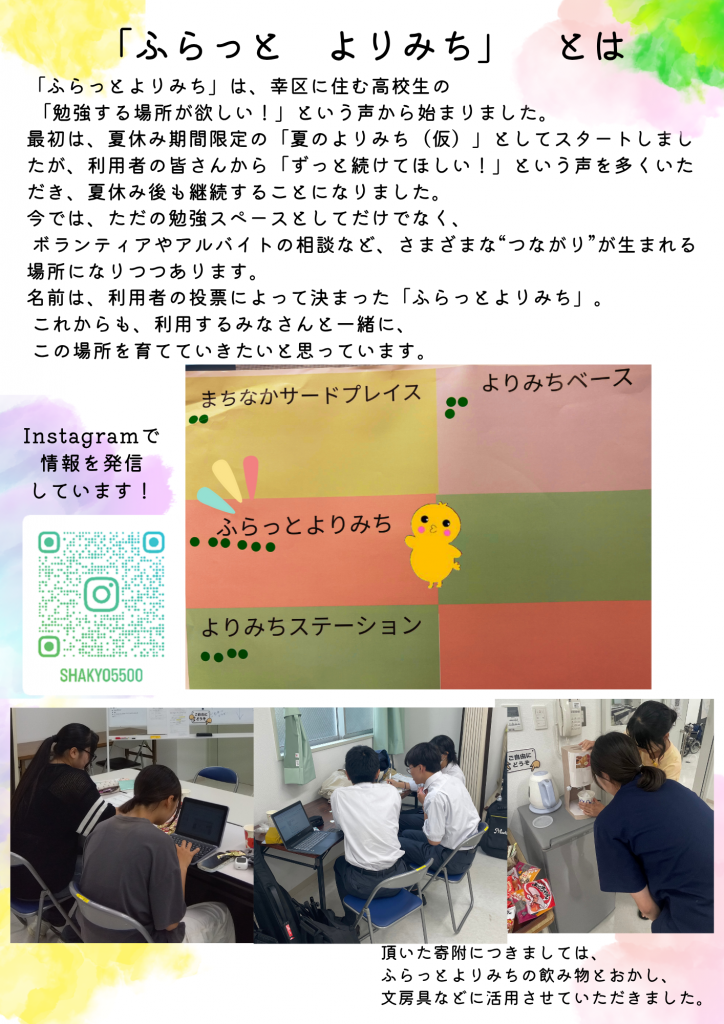 幸区に住む高校生の「勉強する場所が欲しい!」という声から、当初は夏休み期間限定で始まった「夏のよりみち(仮)」。